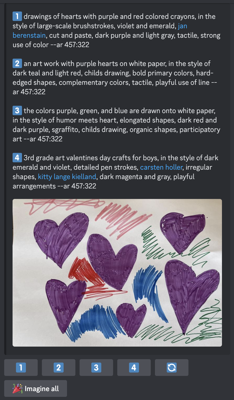 After the /describe command runs, Midjourney generates several prompts to describe the uploaded image. We'll use these prompts to create digital renditions of the artwork. Here are the prompts we received: