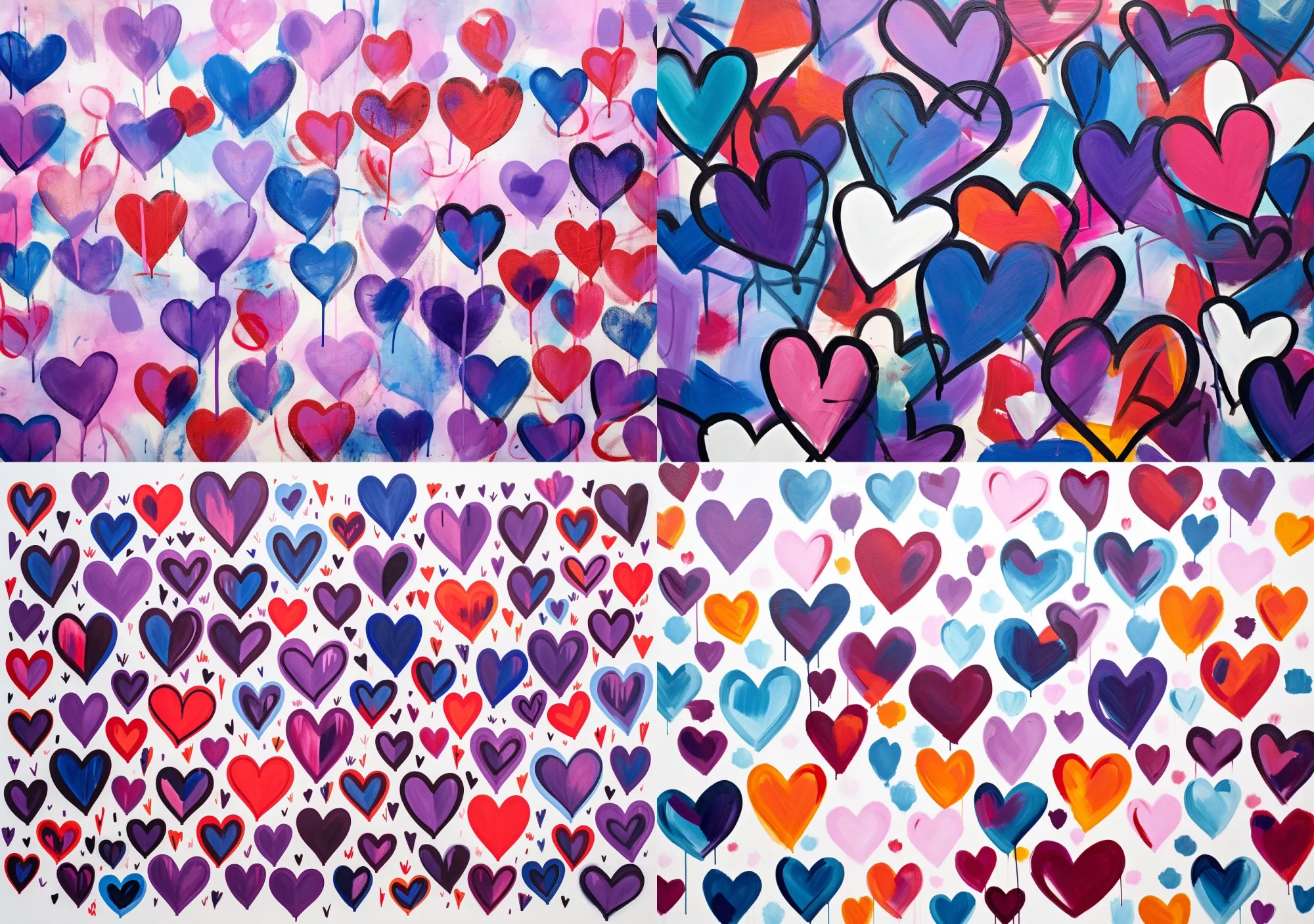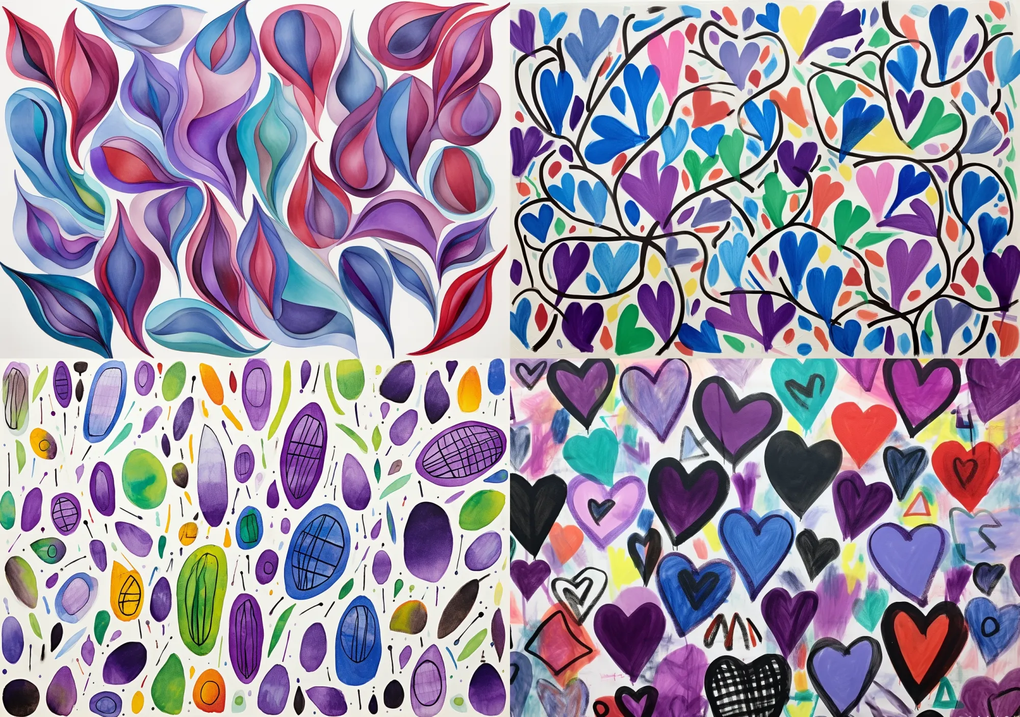 /imagine an art work with purple hearts on white paper, in the style of dark teal and light red, childs drawing, bold primary colors, hard-edged shapes, complementary colors, tactile, playful use of line --ar 457:322