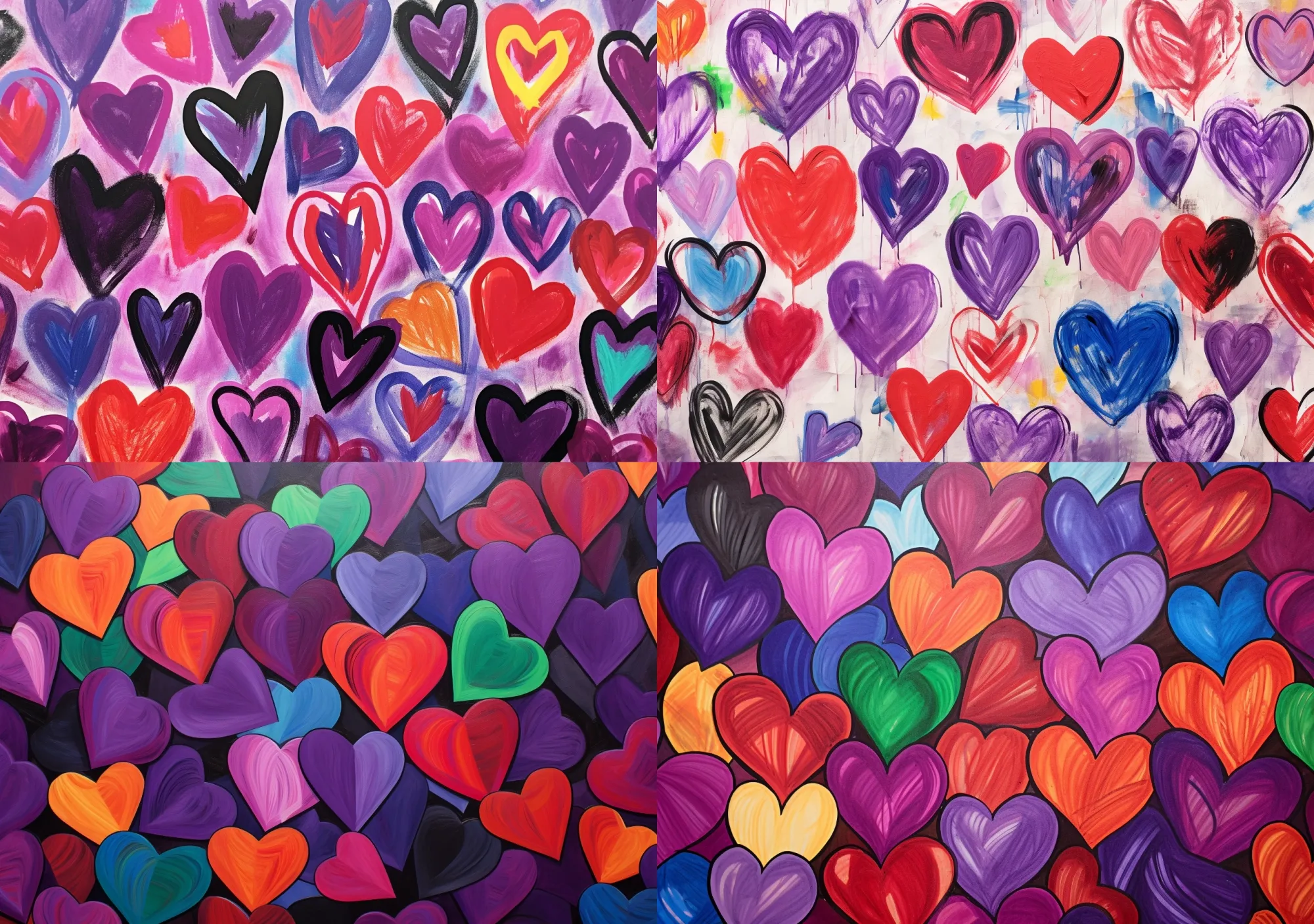 /imagine drawings of hearts with purple and red colored crayons, in the style of large-scale brushstrokes, violet and emerald, jan berenstain, cut and paste, dark purple and light gray, tactile, strong use of color --ar 457:322